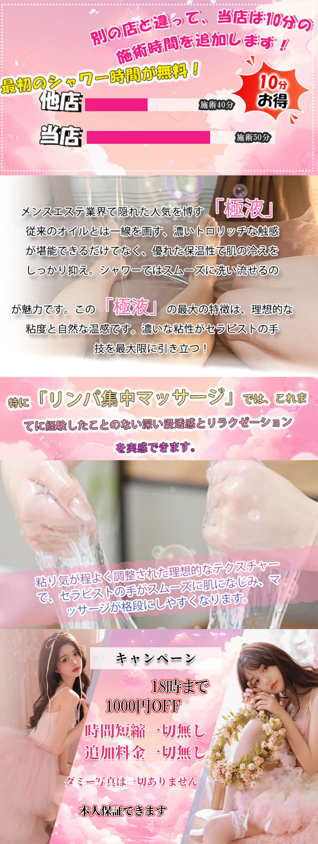 当店では、アロマオイルの効能と当店自慢のセラピストによるリンパマッサージの相乗効果による、癒しのひとときをお客様お一人お一人にお届けしております、自然で心やすらぐ優美な香りを、施術中はもちろんご帰宅お休みになってから翌日朝目覚めでまで楽しんで頂けます、どうぞゆっくりご堪能ください。